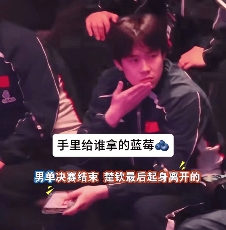 在决赛现场,所有的国乒教练组员和队员们都坐在前排,一起为场上的球员加油,有眼尖的人看到进场时王楚钦手上拿着一盒蓝莓,在比赛充满不确定的紧张程度下,大头是一粒都没心思吃,全程都在聚精会神的看球。而在结束后队友们纷纷回到酒店,盯到刚下车的莎莎手上提着一个蓝莓空盒,大家纷纷猜测大头的这盒蓝莓肯定是留给莎莎的,在回路上孙颖莎吃完了,于是有人就说了王楚钦真细心,晓得莎莎爱吃蓝莓给她留,大头恋情曝光了?