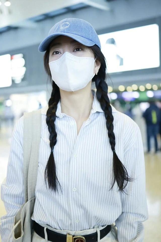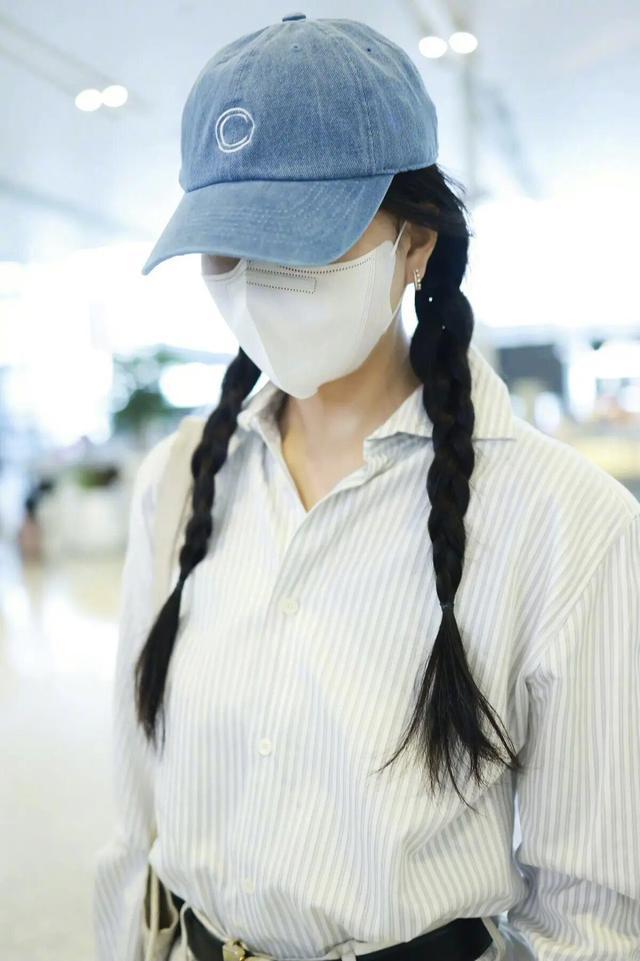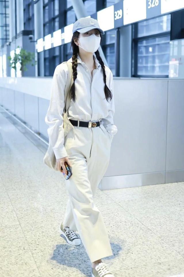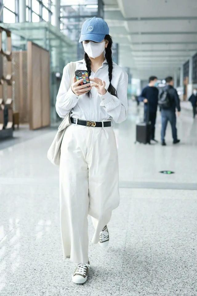 配色上,蓝白+白色也很和谐,温柔显白不挑肤色,并且在这套机场造型中,她用一顶蓝色棒球帽与衬衫的蓝色调呼应,再搭配黑色腰带与帆布鞋,让整体造型在简约中多了几分街头感与活力。黑色腰带不仅起到了分割比例的作用,金属扣的设计也为整体增添了精致细节,避免了全白下装的单调。